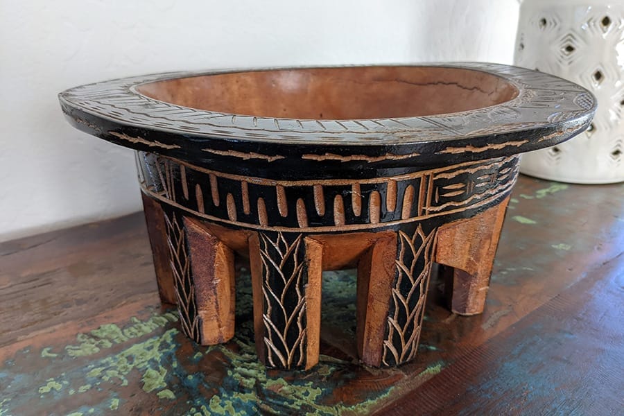 You can always tell if a kava bowl is Samoan by the number of legs it has; there are often a lot! It’s common for a Samoan kava bowl to have ten or more legs and intricate construction. You can find both round and oval-shaped Samoan kava bowls. Samoan tanoas are often decorated with traditional carvings that have been blackened to make them stand out from the wood.