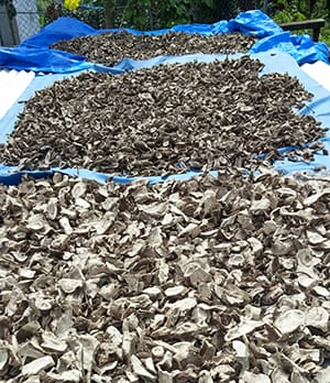 The stump and kava root are then placed into bins or onto plastic sheets, on top of rocks, or on corrugated iron roofing panels and either laid out in the sun to dry or placed into drying houses. Once completely dry the kava is then pounded or ground into a powder and ready for consumption or export. How kava is pound or ground differs by island. The traditional method on Vanuatu is to grind the kava down using limestone on a slab. On other islands, a pestle and mortar method is used.